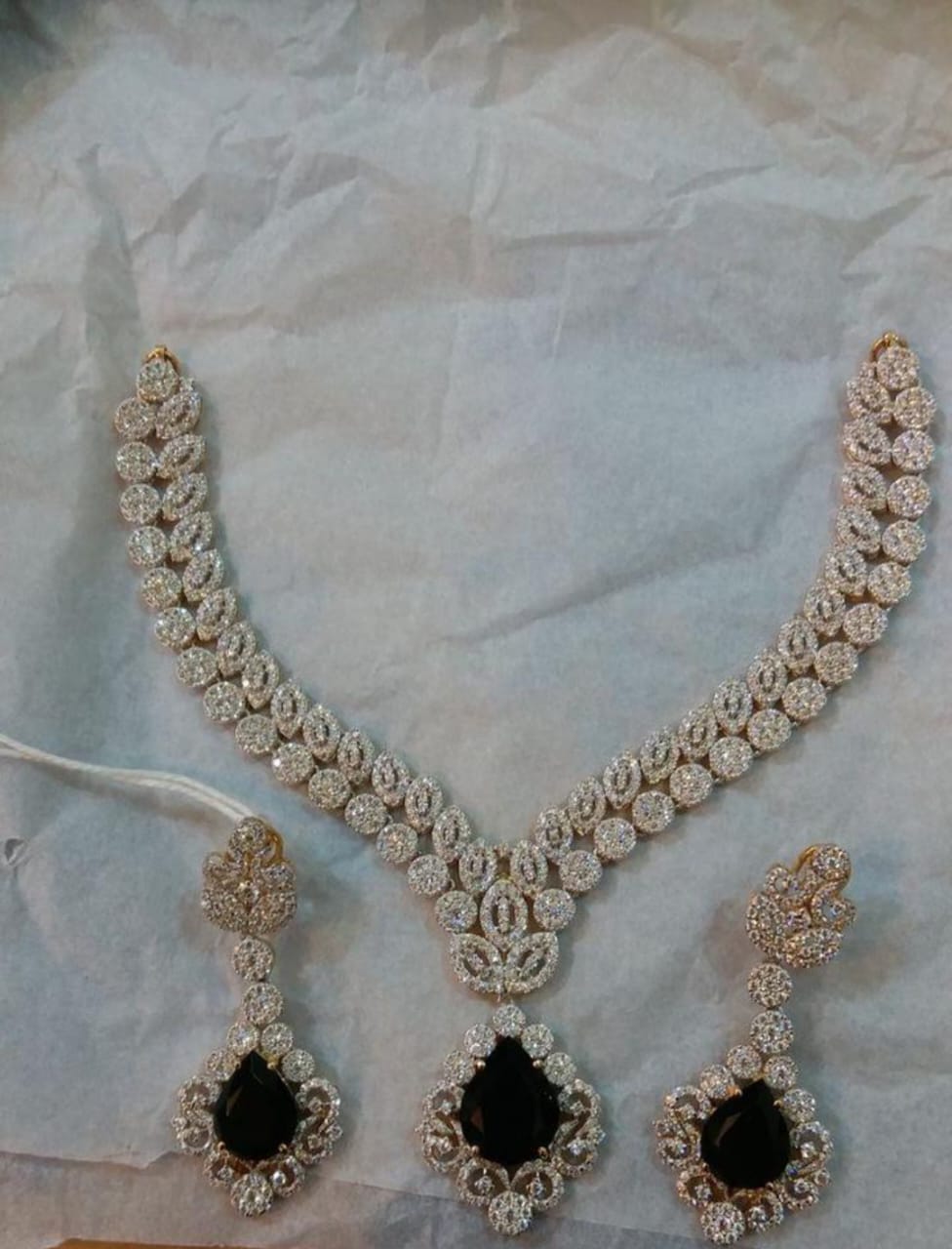 Yeh elegant necklace set 925 sterling silver se bana hai aur is par gehre black stones aur chamakte high-quality zircon stones ki detailing hai. Black stone center piece ke ird gird sparkle karte hue zircons is jewellery ko har angle se dazzling effect dete hain. Har link aur earring ka design bohot nazakat se banaya gaya hai, jo traditional aur modern dresses donon ke saath perfectly match karta hai.