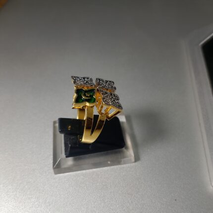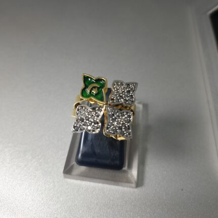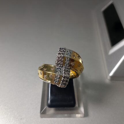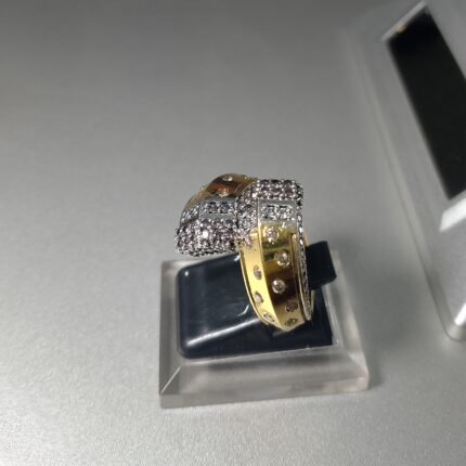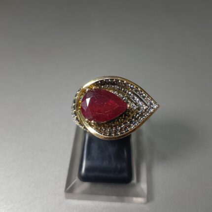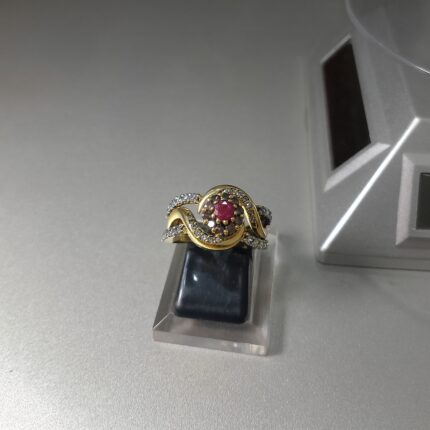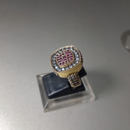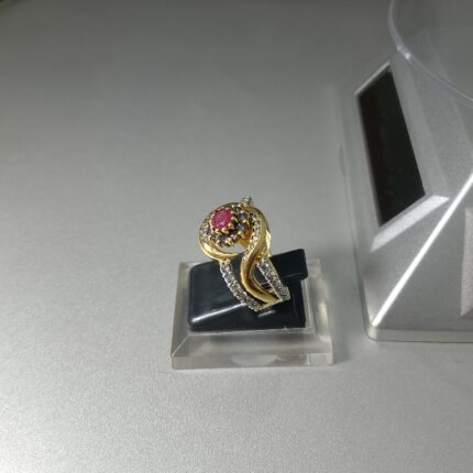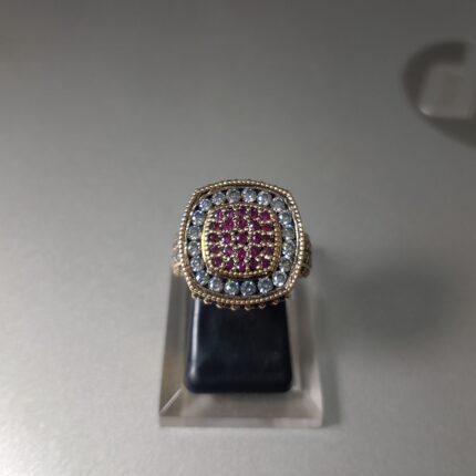 This is a two-tone gold, diamond, and ruby cluster ring.
