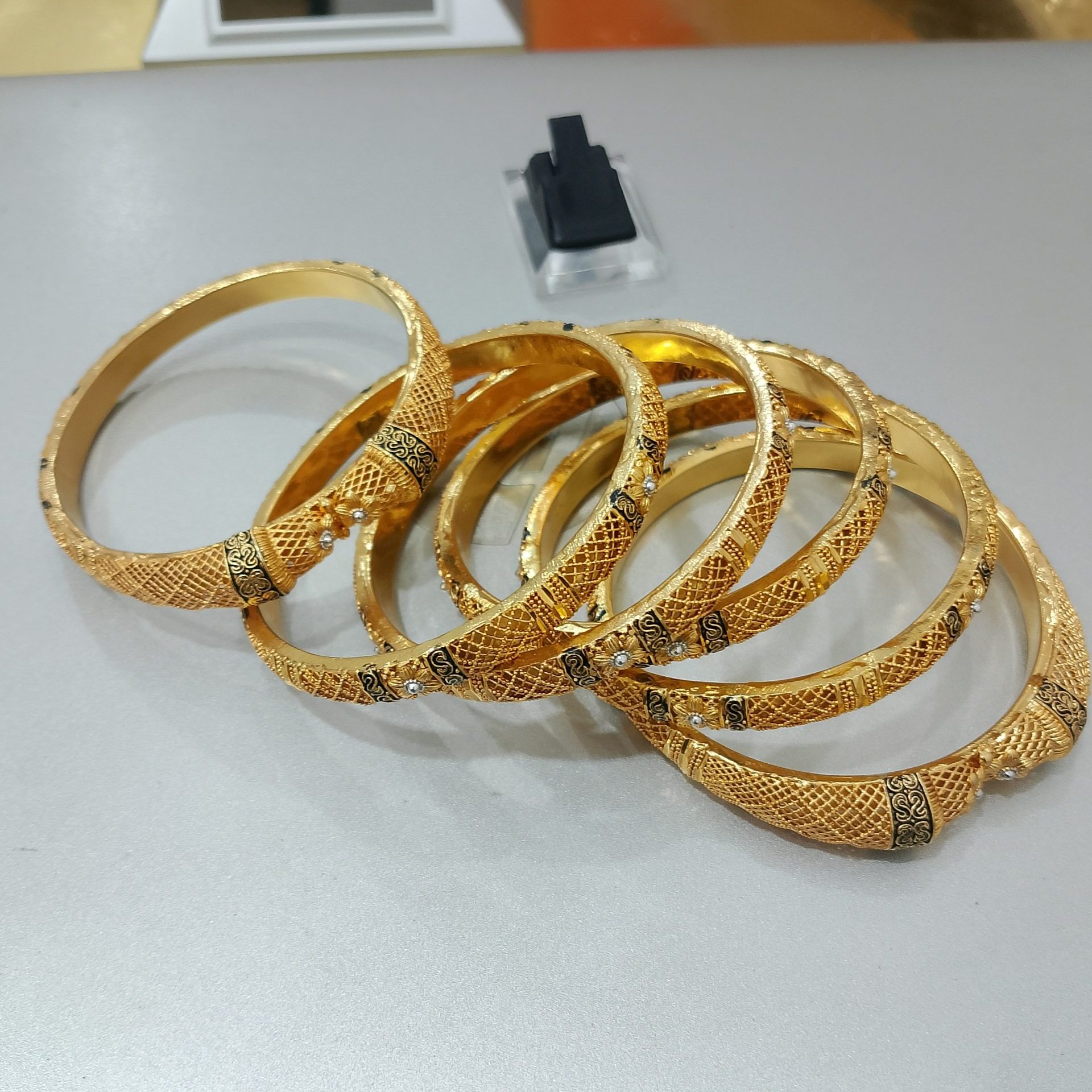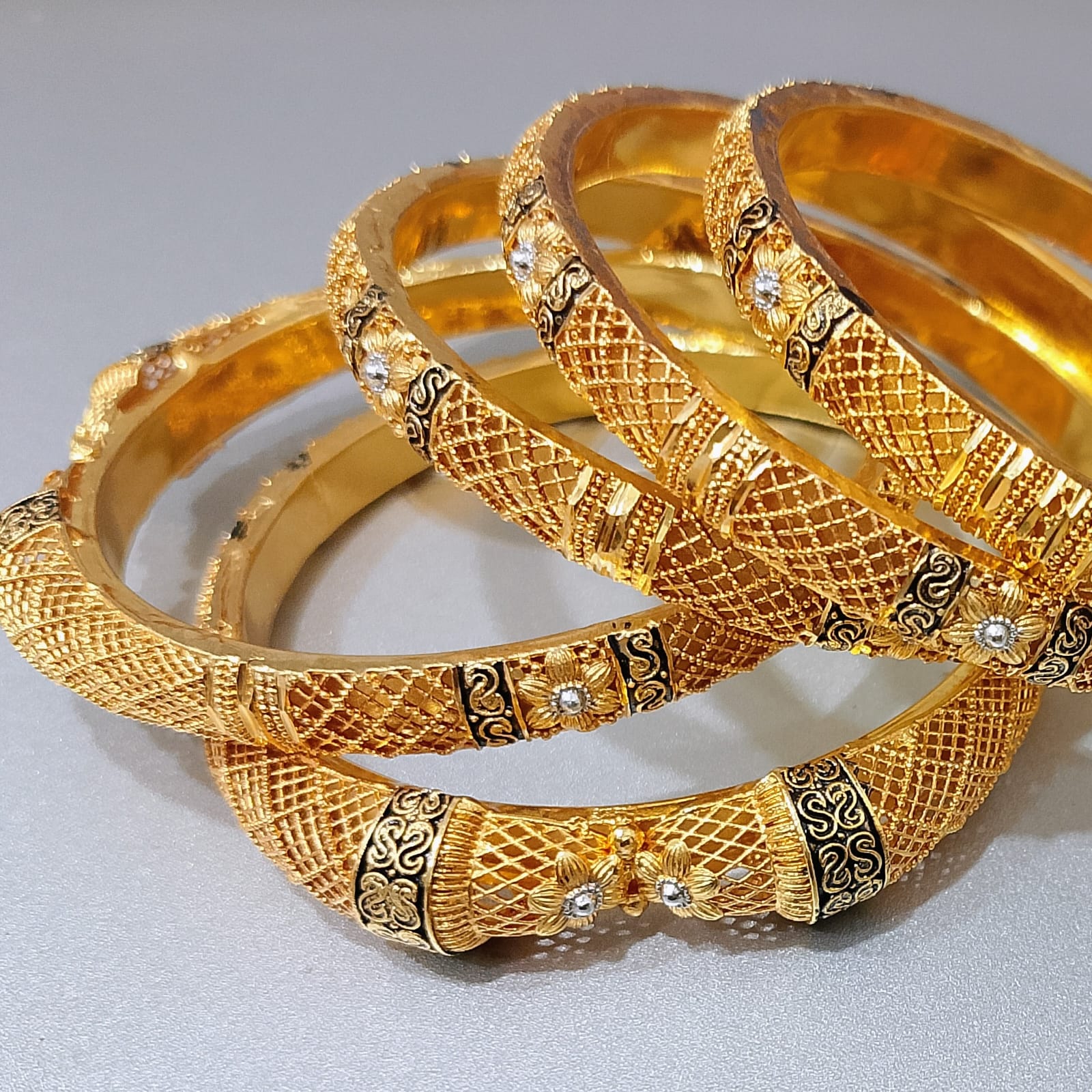 Zuha Jewellery Karachi ka best 925 silver gold plated bangles set pesh karta hai – yeh heavy bridal churiyan Pakistani weddings ke liye banayi gayi hain. 925 Sterling Silver base se handcrafted, yeh set 6 pieces ka hai with floral design aur black enamel finish. Karachi ki workshops mein banaya gaya, yeh set durability aur elegance deta hai.