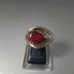 Crafted with a captivating pear-shaped red sapphire centerpiece surrounded by sparkling cubic zirconia accents, this ring captures the essence of vintage glamour with a modern edge. The warm gold plating over genuine 925 sterling silver creates that luxe look you crave without the fine jewelry price tag, because looking expensive shouldn’t actually be expensive.