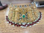 • Grand choker with intricate antique gold plating, emerald centre, ruby beads, and pearls.