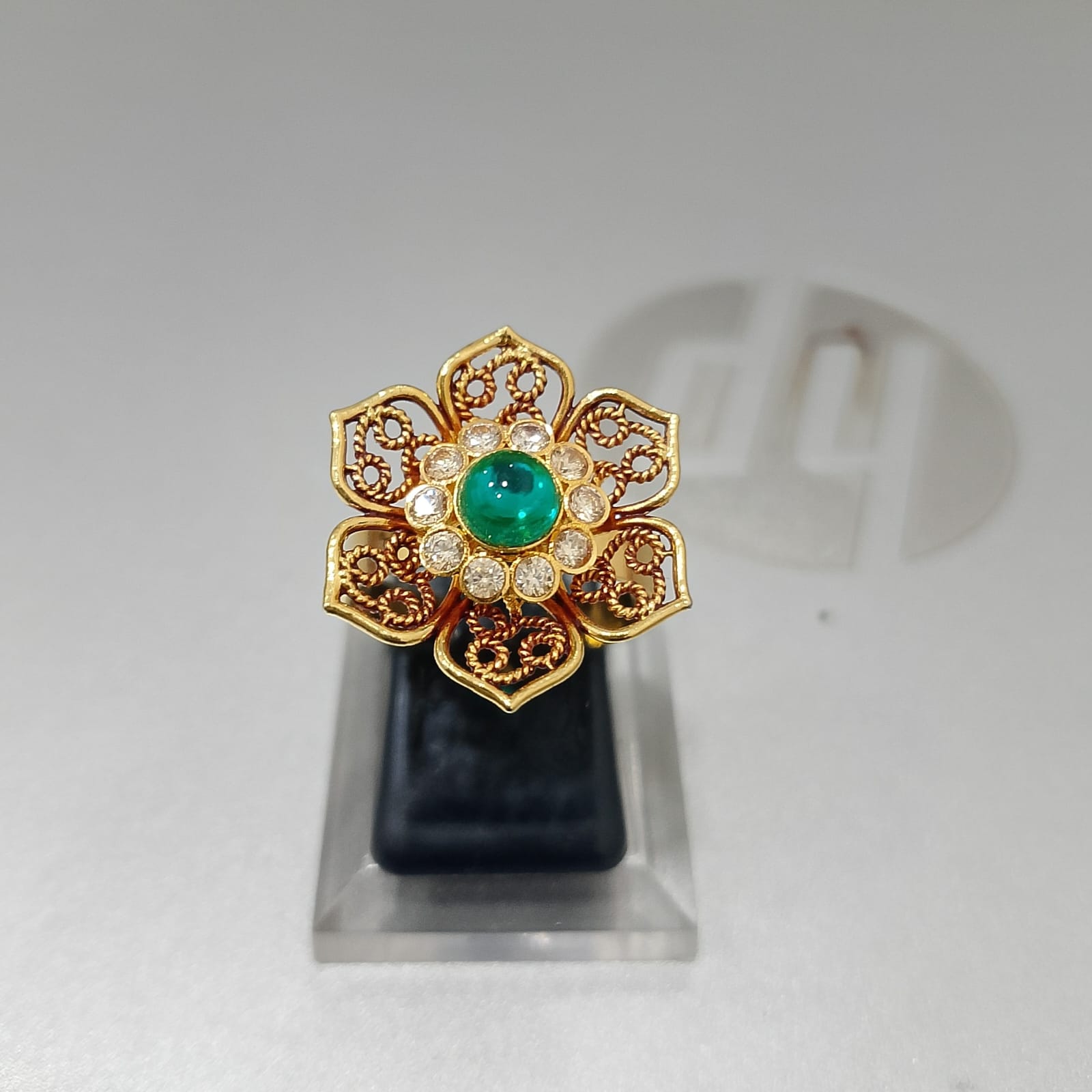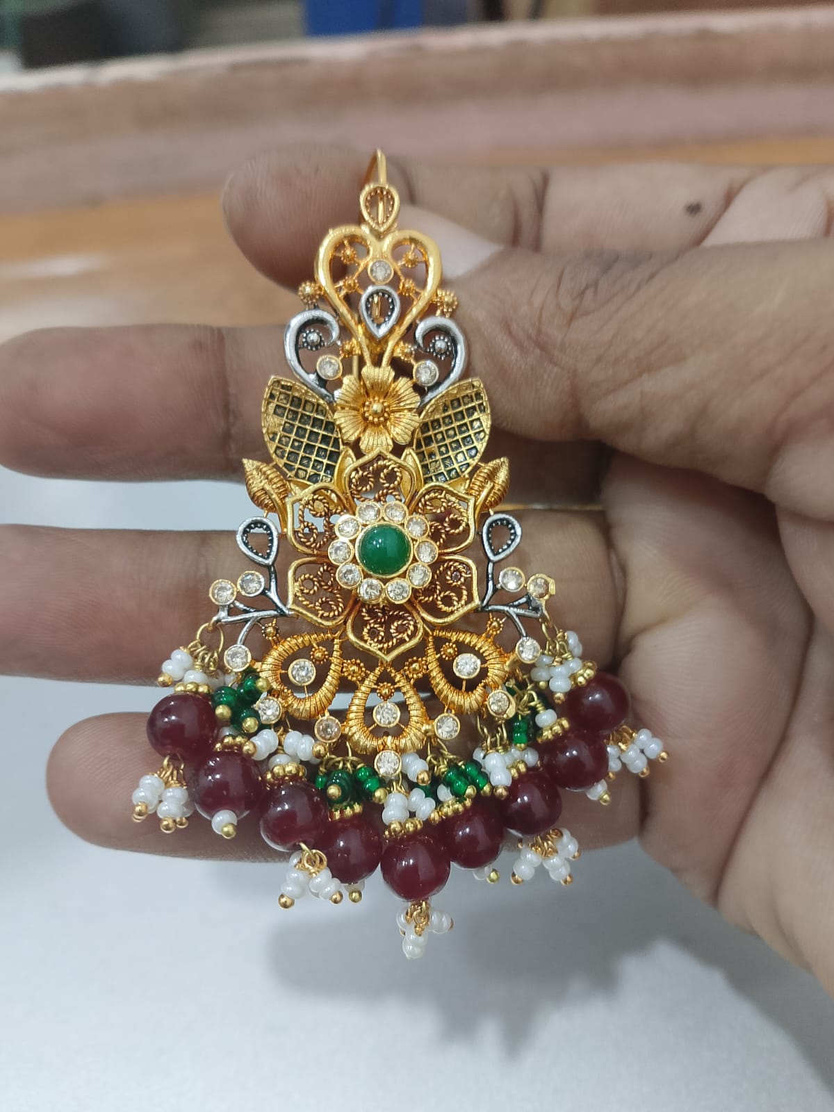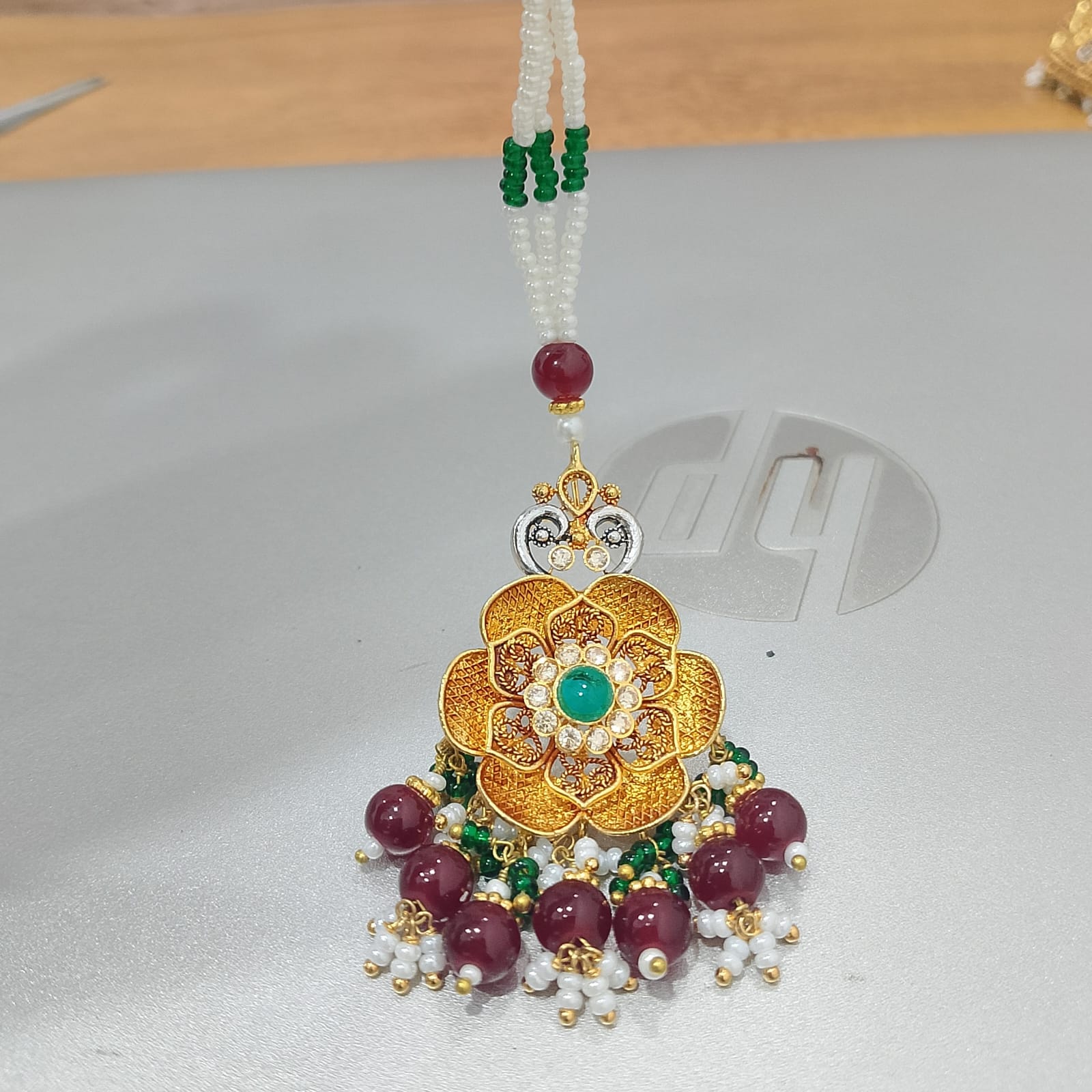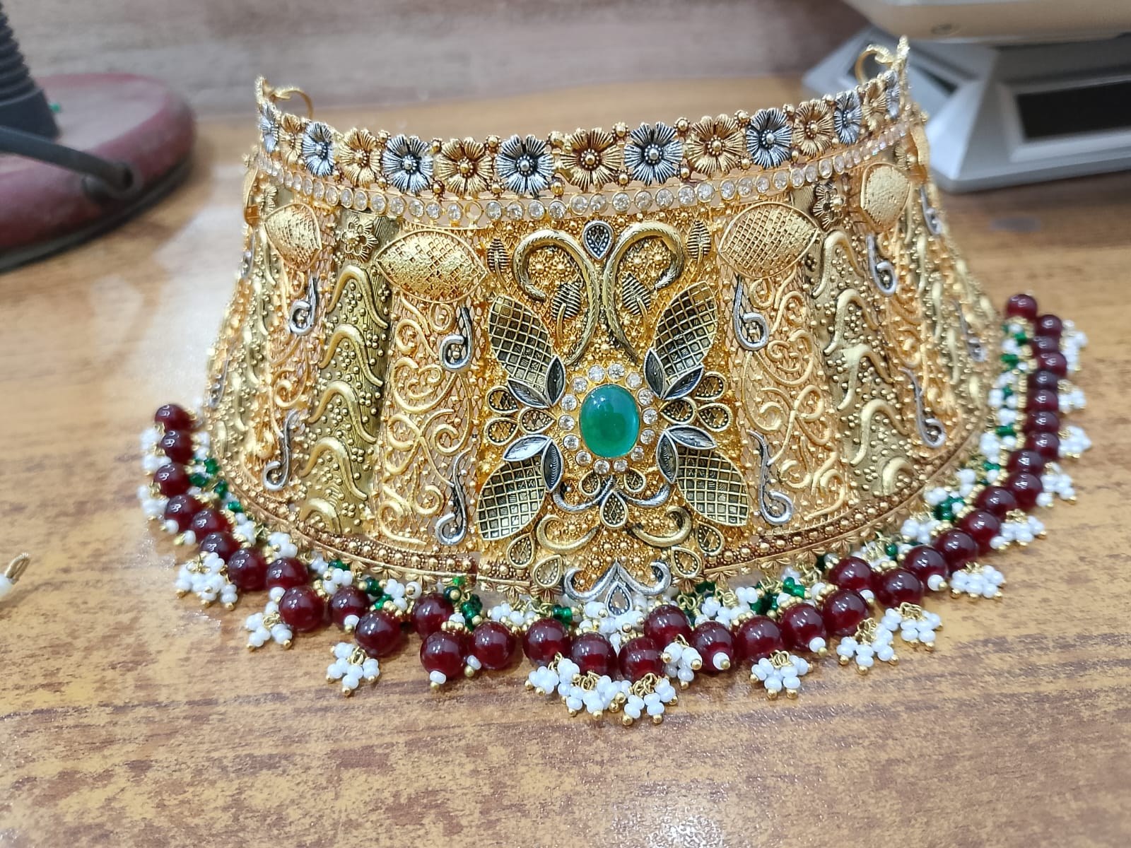 • Grand choker with intricate antique gold plating, emerald centre, ruby beads, and pearls.